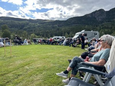 Lørdag kveld var det tid for å samles i teltet igjen, for felles middag, premieutdeling fra dagens aktiviteter/konkurranser og litt allsang. Kåre, med sine ansatte på campingen, vartet opp med herlig kjøttgryte fra gårdens Hereford-dyr. Det ble servert sammen med ris og salat. Maten smakte fortreffelig. Etterpå tok Åsmund Jahr fram gitaren og det var tid for allsang. Gode, gamle «country-svisker» fra 1960 og utover gjorde at alle kunne synge med.